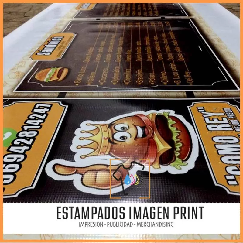 Lienzo tela de pvc, con promociones o eventos, con terminación, sellado y ojetillos para que lo puedas colgar los tamaños pueden variar.